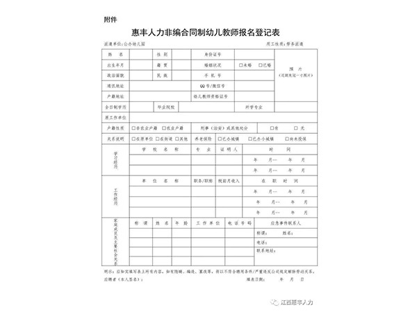 為滿足我市公辦幼兒園師資需求,我公司面向社會公開招聘一大批非事業(yè)編合同制幼兒教師,以勞務(wù)派遣的方式與用人單位進行勞動力資源開發(fā)合作?,F(xiàn)將有關(guān)事項公告如下:一、招聘人數(shù)及崗位我市招聘非事業(yè)編合同制幼兒教師50名,具體崗位在選崗前公示。二、招聘方式通過第三方勞務(wù)公...